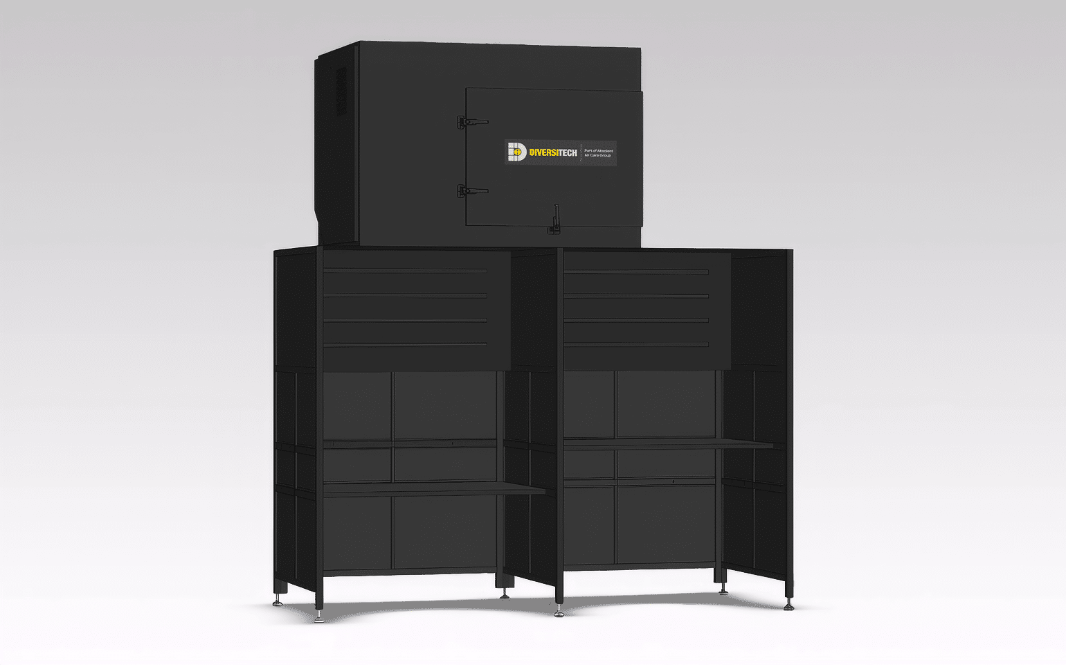 The WB-3500 welding booth is constructed of heavy (12 gauge) dual panel walls with both updraft and back-draft. Vacuum flow can be sourced from a stand alone filtered collector or a top mounted collector integral to the booth(s). This booth is available in both single or dual configuration and comes standard with overhead explosion proof lighting and debris clean-out drawers. This is Diversitech’s only β€œstand in front” booth with an optional fully enclosed wrap-around curtain.